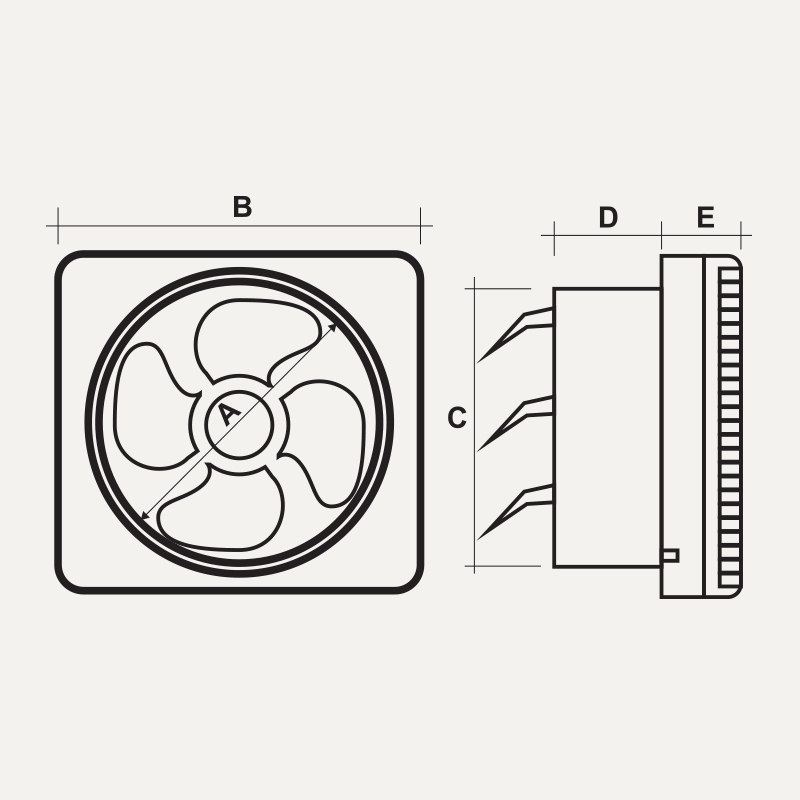 MPE Wall exhaust fan size (AxBxCxDxE): 250mm x 335mm x 280mm x 83mm x 61mm