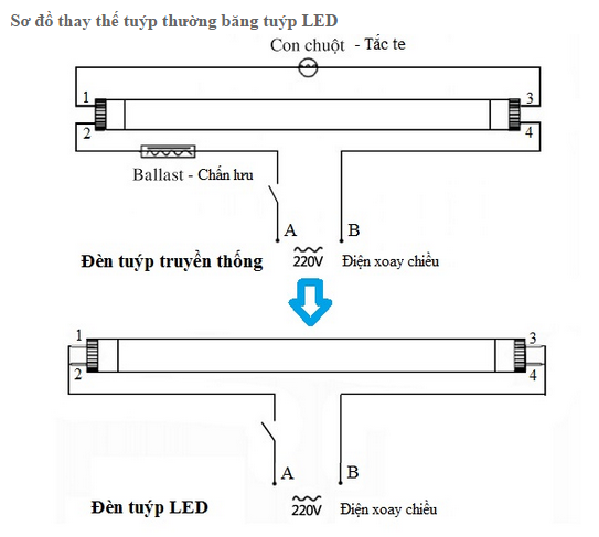Quy trình thay bóng tuýp LED vào máng cũ của đèn tuyp huỳnh quang: